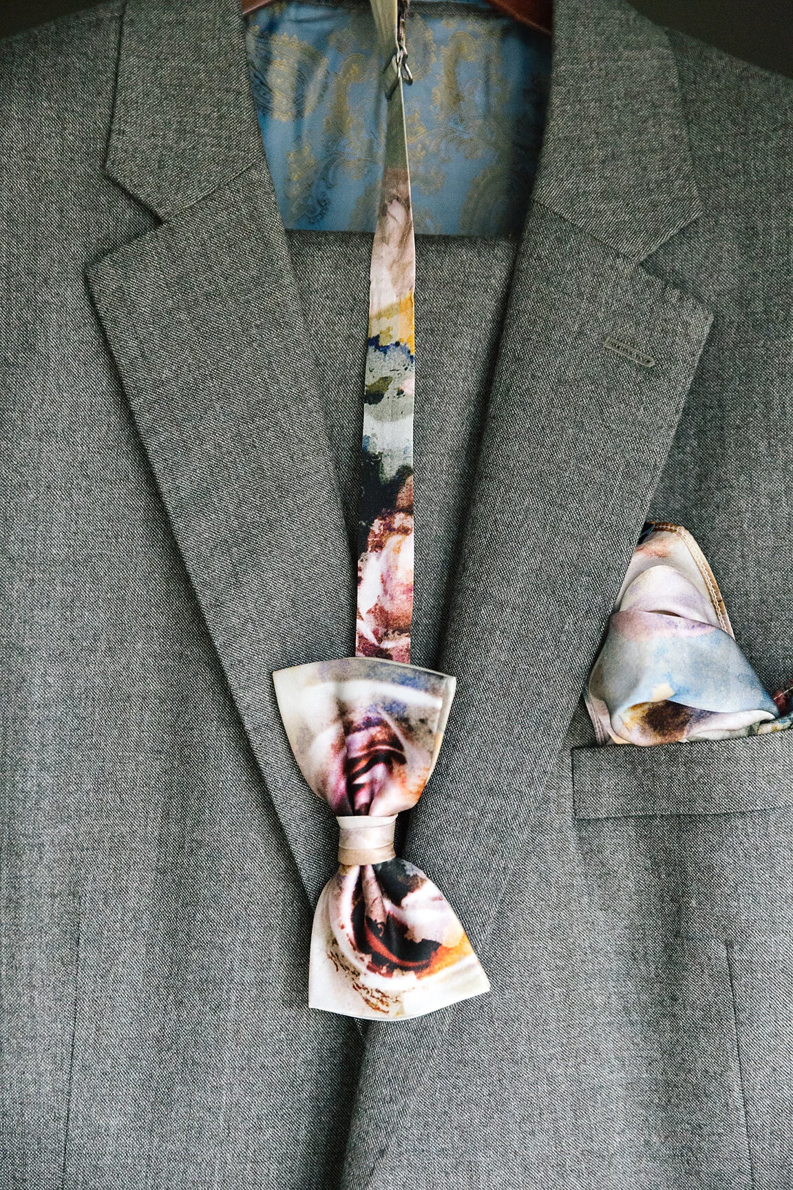 • Dark beige suit, white shirt, and pastel bow tie and pocket hank